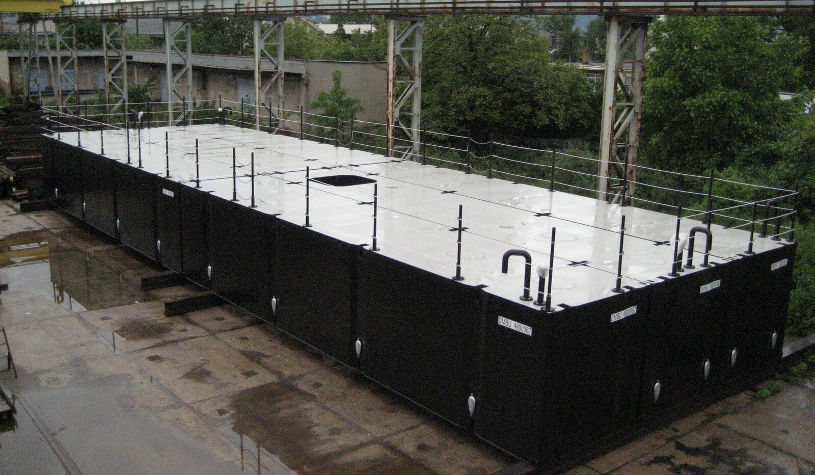 Весь корпус состоит из стальных модульных понтонов, контейнерного типа. Эти модульные понтоны могут быть собраны в